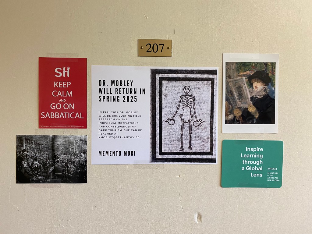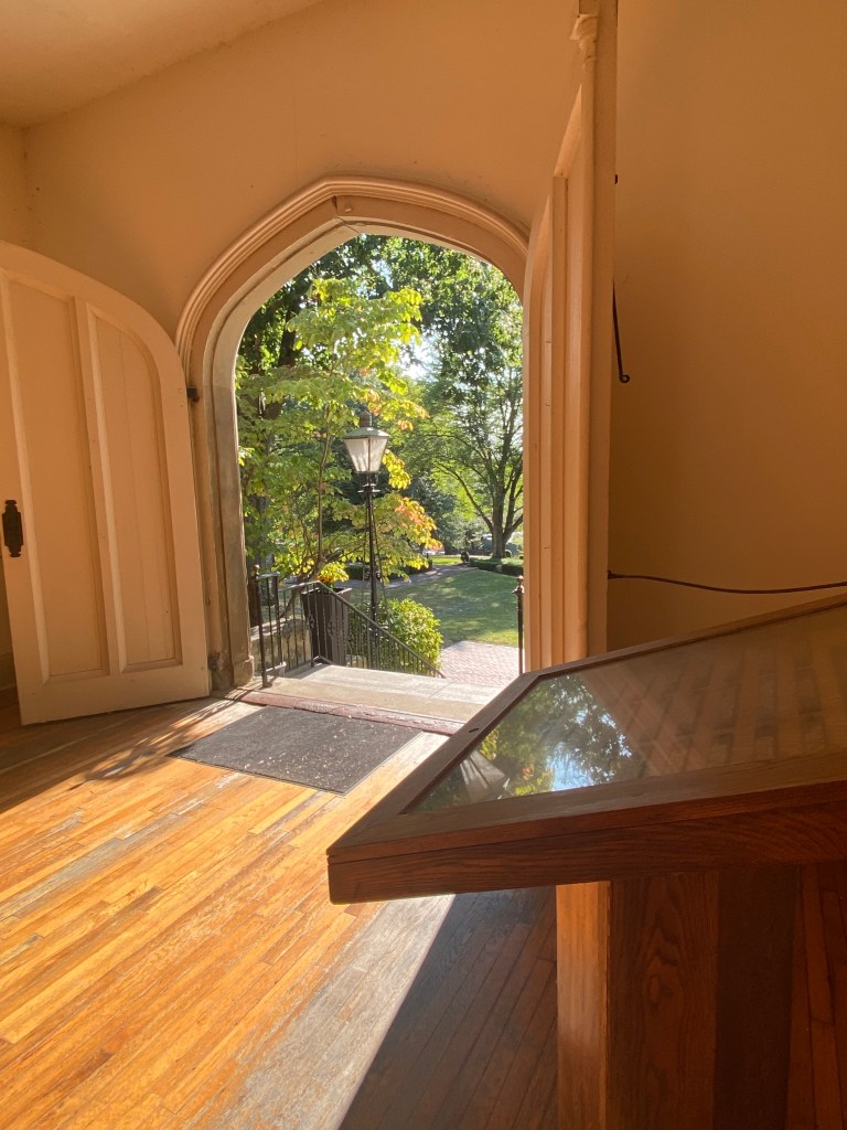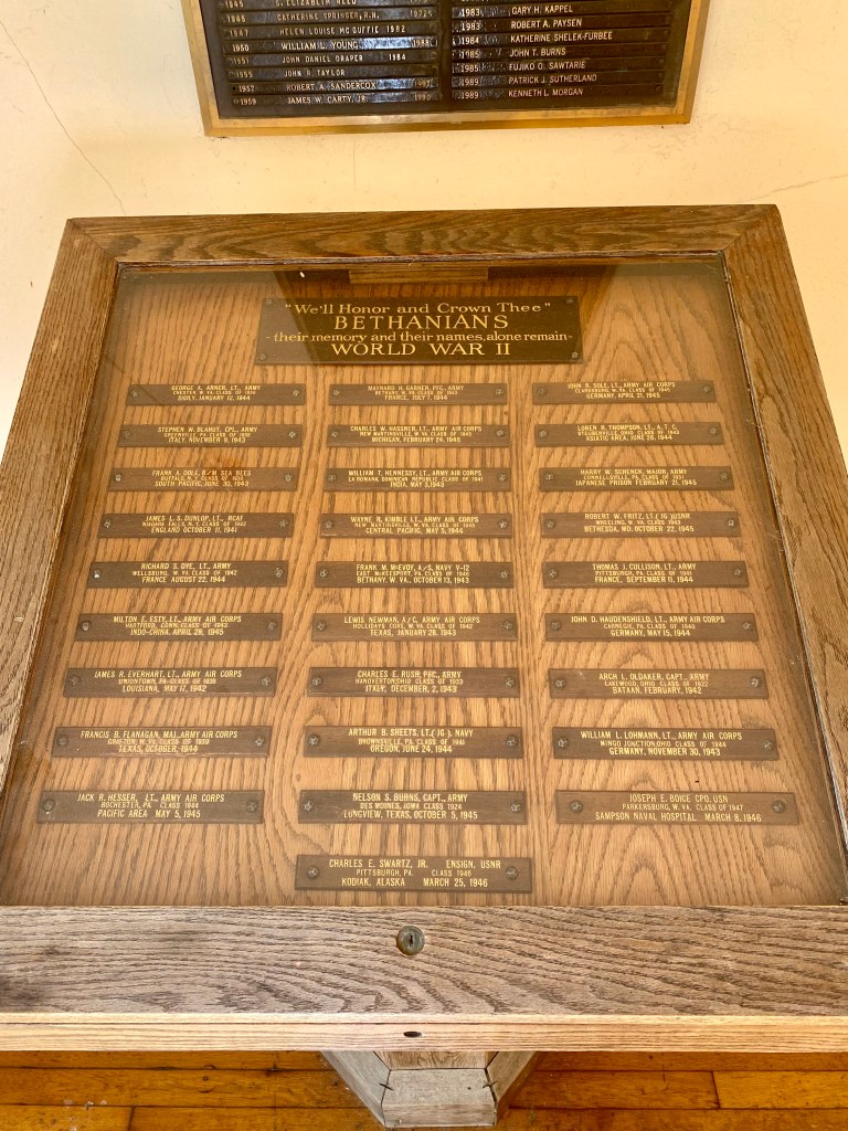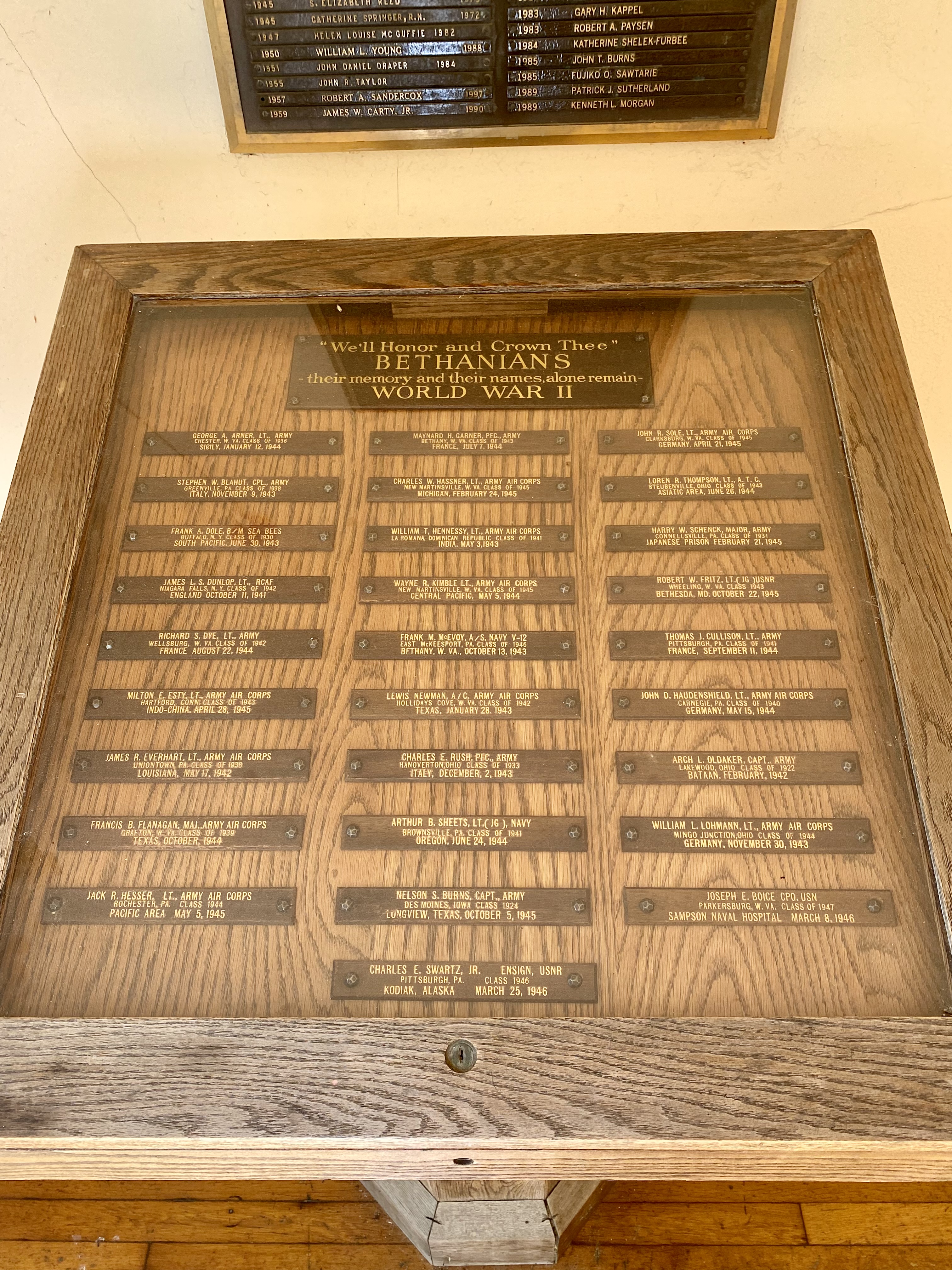 My first stop for this project was the Bethany College War Memorial. This memorial is a small lectern with the names of Bethanians who died in World War II. It sits in a place of prominence, outside of the central administrative offices in Old Main, but I’ve never noticed anyone engaging with it. Some of those who died were locals, from places like Wellsburg and Wheeling, but some traveled to Bethany from great distances, such as Buffalo, NY and the Dominican Republic. They died all over the world – in India, the Philippines, Japan, Germany, France, among other places. All of them spent some time in the place I’ve called home for the last six years.