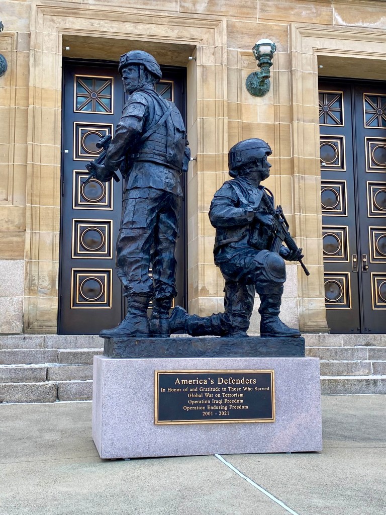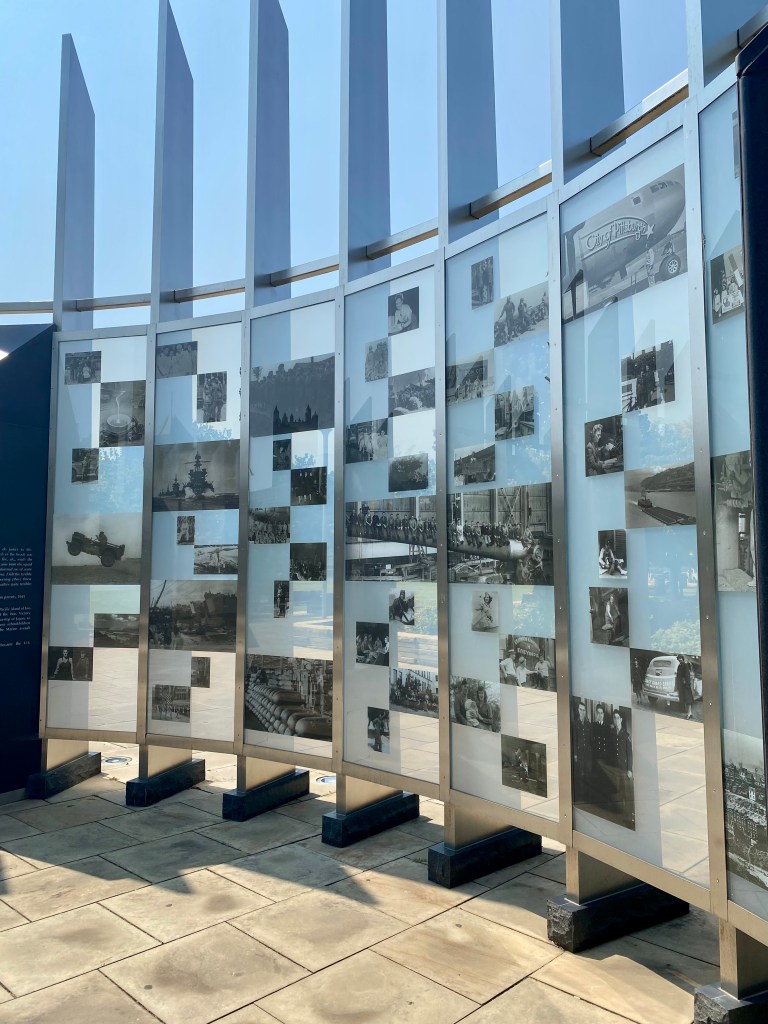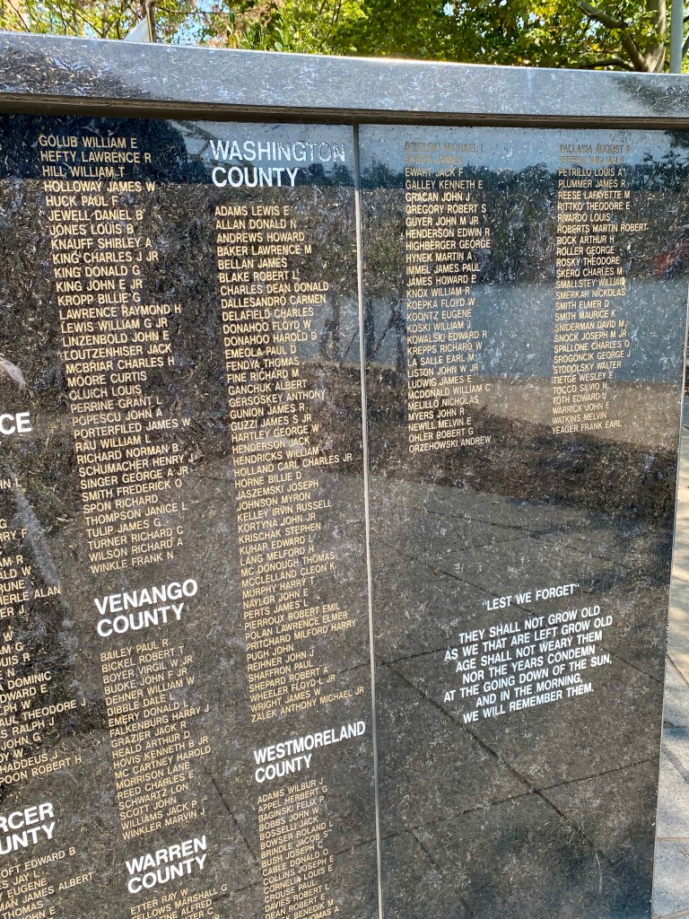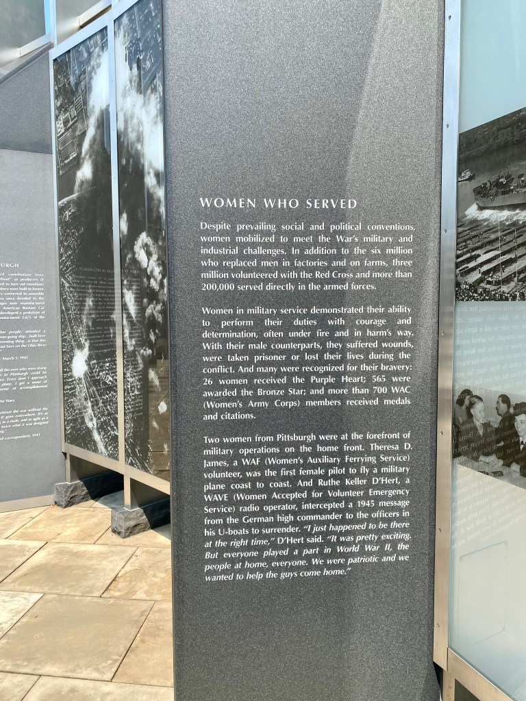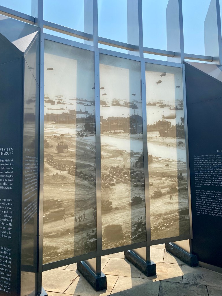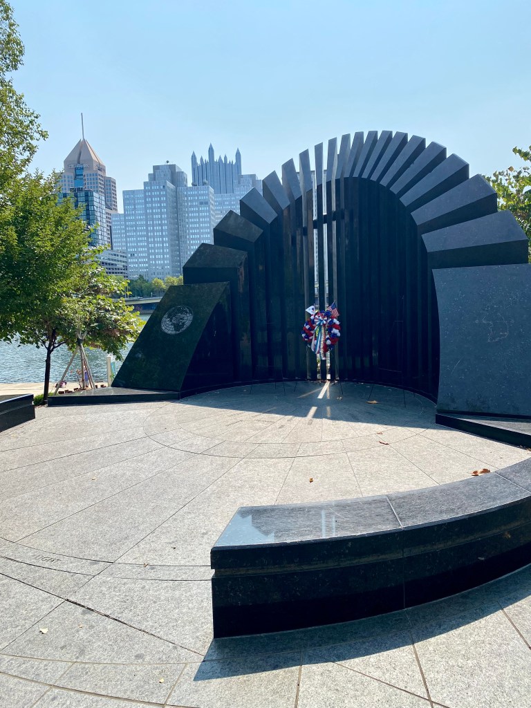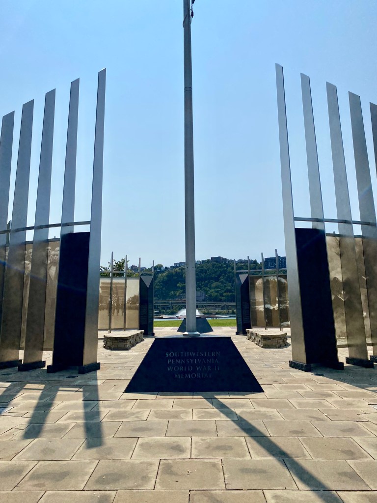 The WWII monument in Pittsburgh is a more recent addition, as its style indicates. In addition to some classic elements, it also incorporates translucent images from the war and large panels of information.